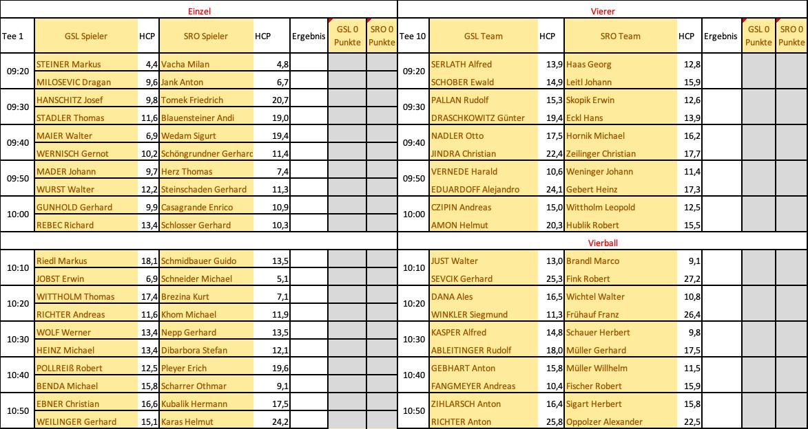 Foursome: (Klassischer-Vierer) je 5 Teams aus (SRO&GSL). Je zwei Spieler spielen zusammen mit einem Ball und schlagen abwechselnd bis zum Einlochen. Ein Spieler schlägt an allen geraden, der andere an allen ungeraden Löchern ab.